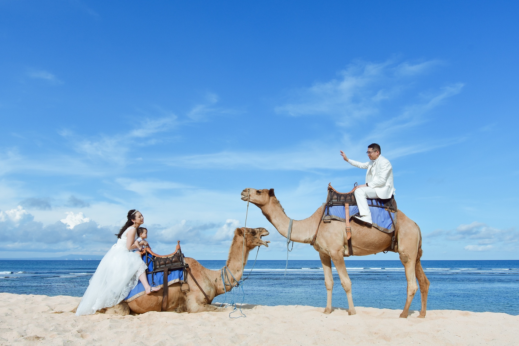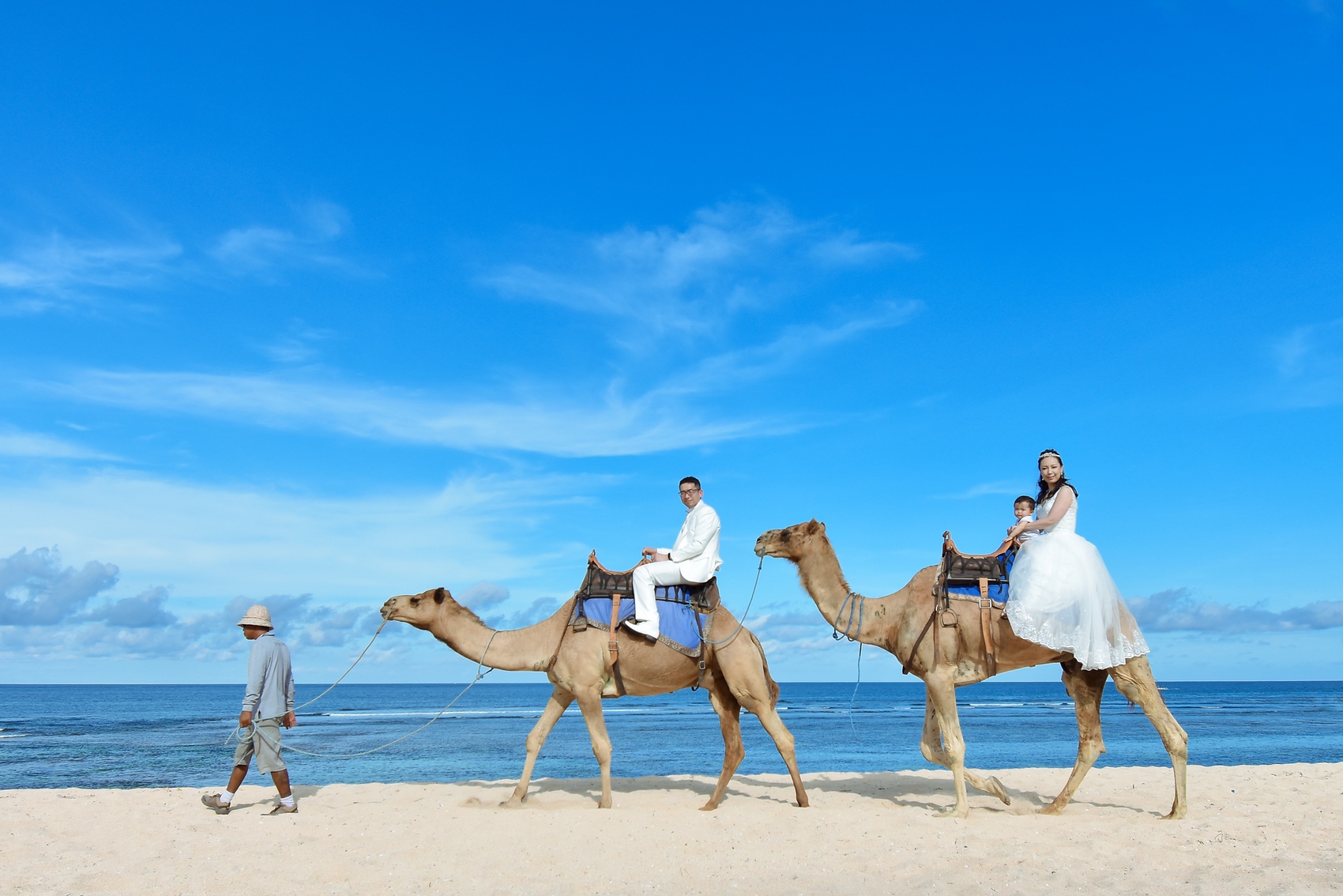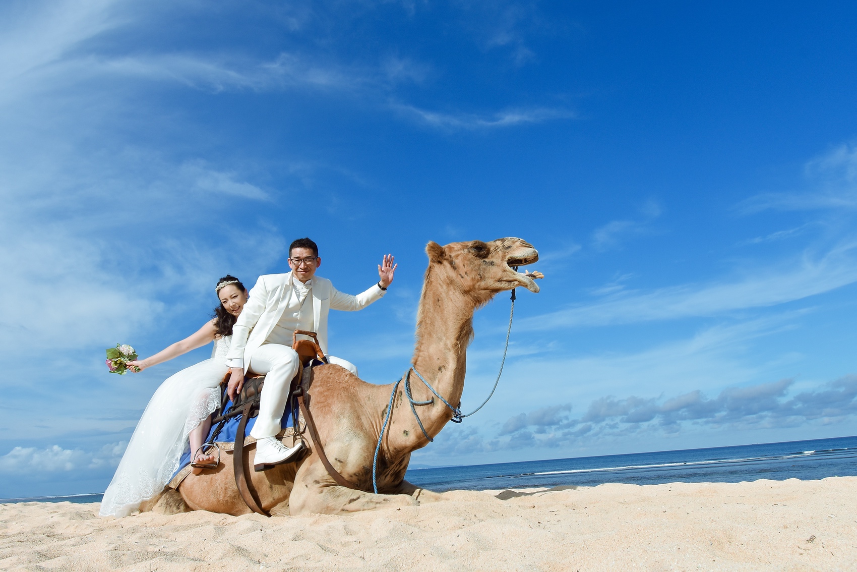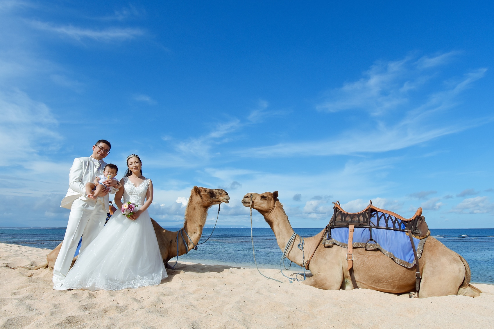 ヒルトンリゾート前で撮影するキャメルフォトは、30分のお散歩を楽しみながらラクダに乗って撮影するだけでなく、ビーチやガーデンも1ロケーションで撮影できるのでお得感が高いです♩