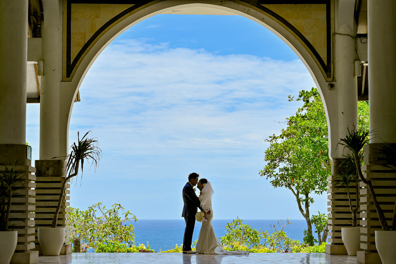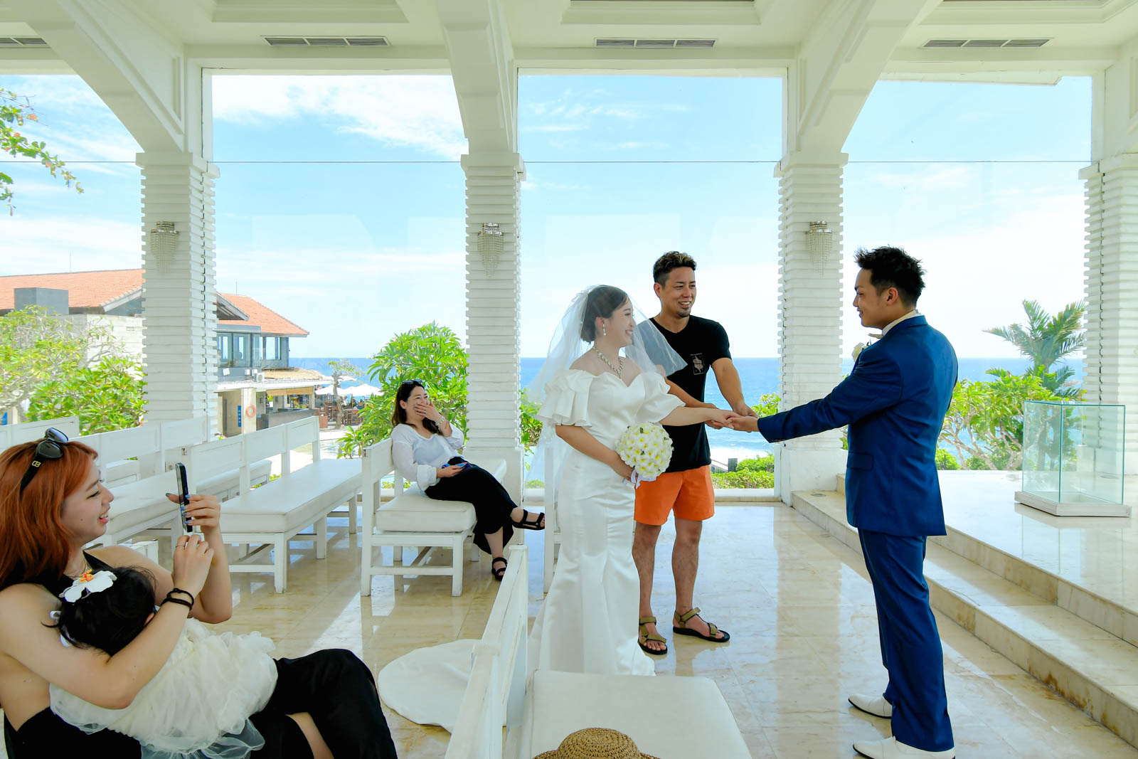 最初はウルワツエリアにあるBlue Point Chapelです。移動に1時間ほどかかりましたが、渋滞はほとんどなくスムーズでした。ご家族も一緒だったので、チャペルの中では挙式風の写真を撮影。みんな笑顔でお喋りしながら、お二人や娘ちゃんを気遣う姿がとても温かくて素敵でした。この日は青空に恵まれ、撮影は順調に進みました!