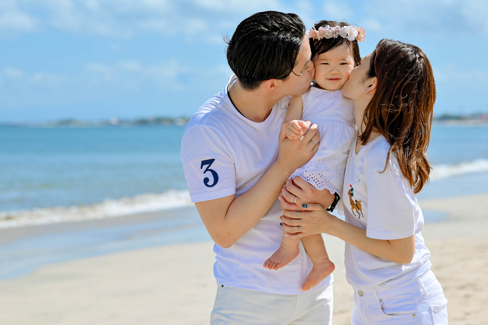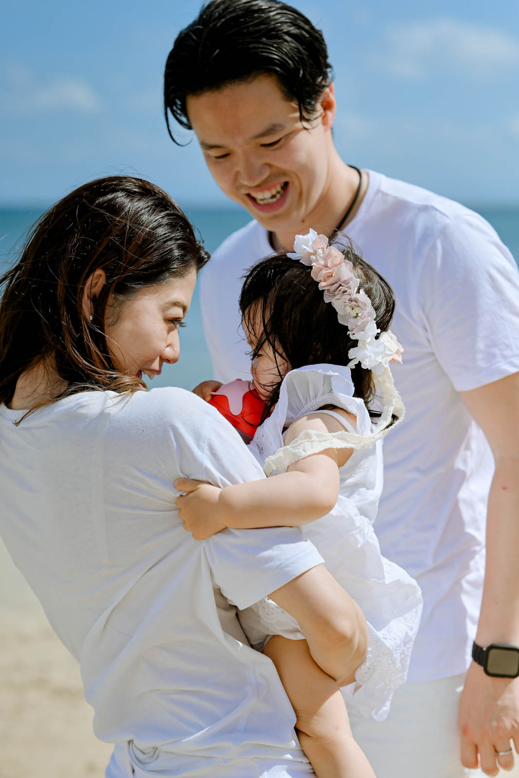 白を基調としたご夫婦とLちゃんのリンクコーデは、バリ島の青い空と白い砂浜にとても映えていました。手をつなぐシーンや、くるくる変わるLちゃんの表情、ご夫婦だけの一枚も🥰 どの瞬間も「今このとき」だからこそ残せる、かけがえのない家族の記録です。