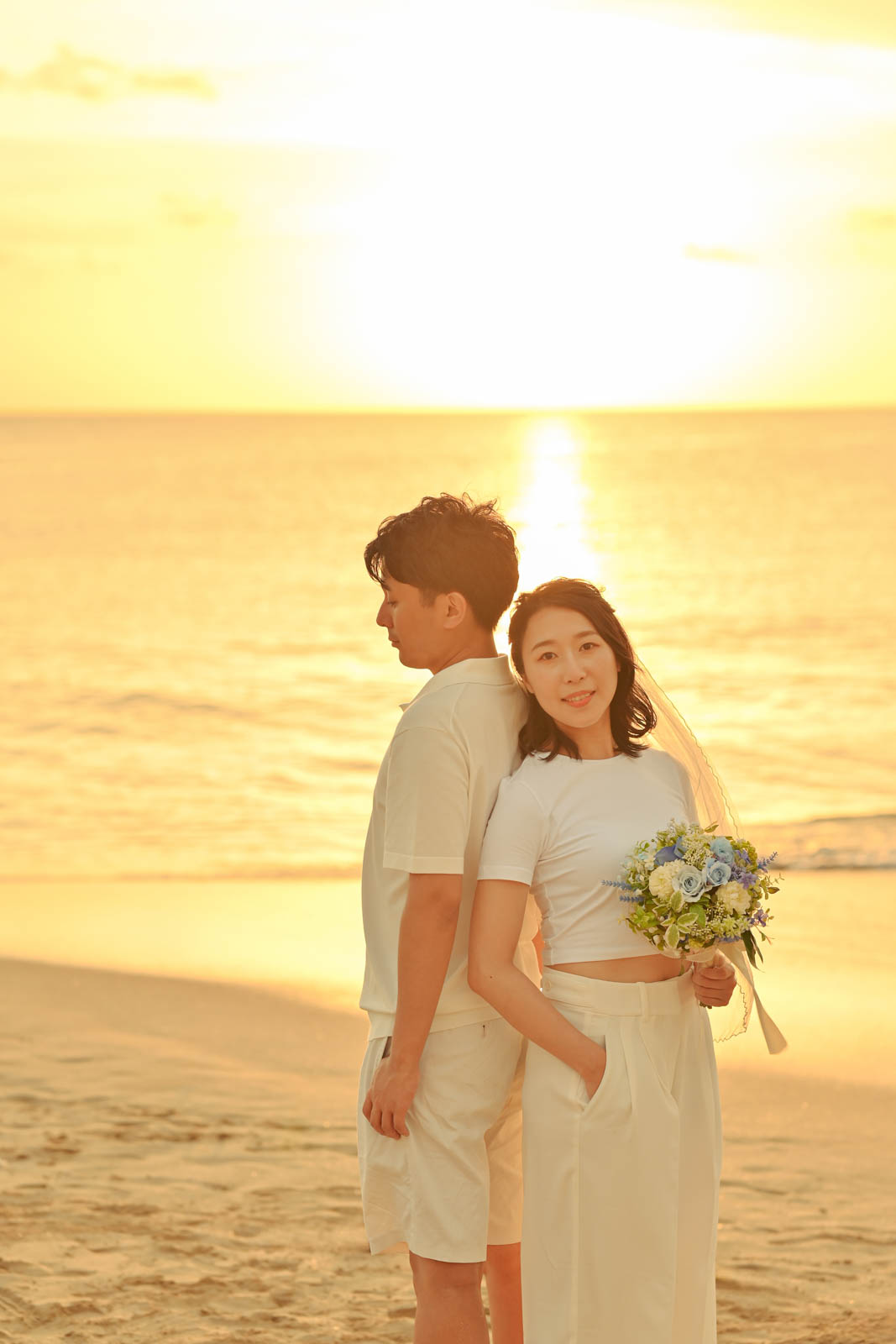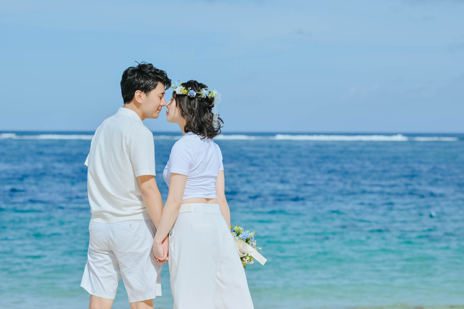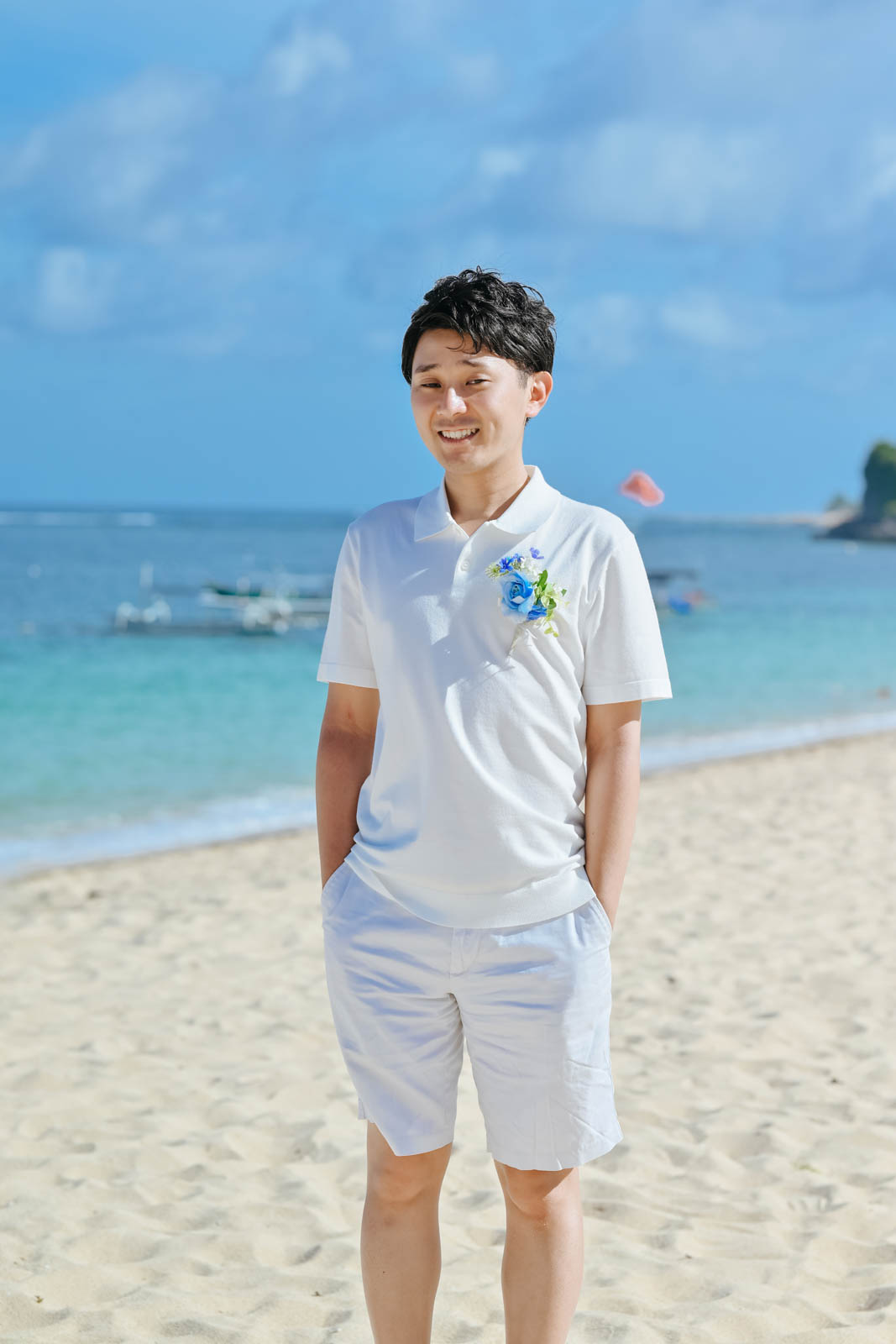 おふたりが選んだのは、私服での「リゾートカジュアル」スタイル。白を基調としたコーディネートに、花冠・ミニブーケ・ブートニアといったアイテムを日本からご持参いただき、ナチュラルながらも写真映えする装いに♡
