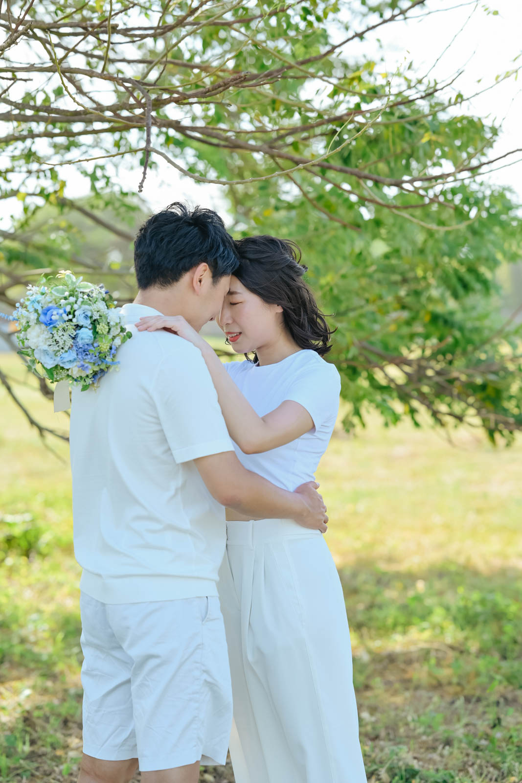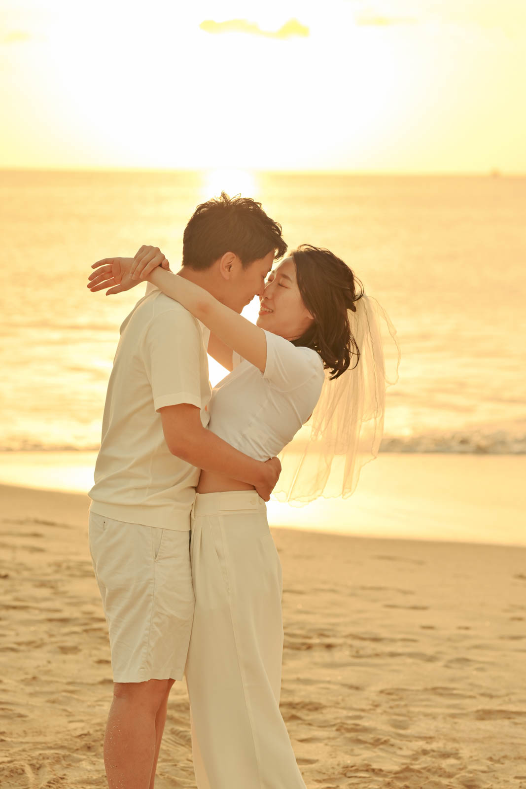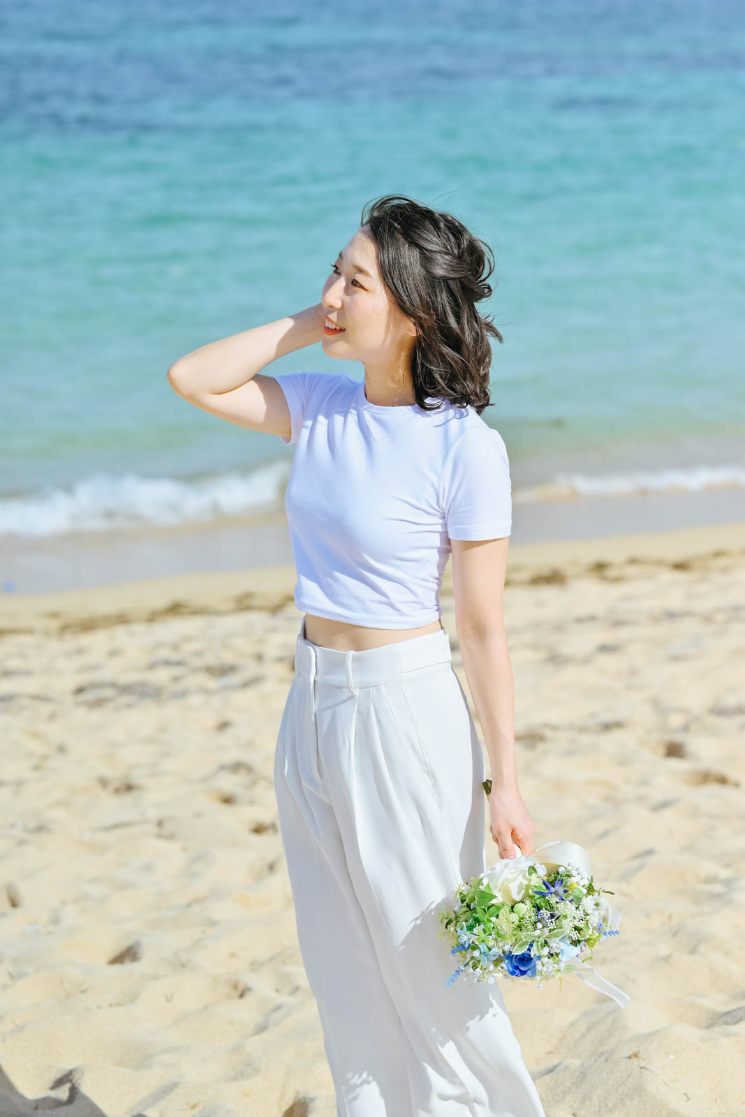 おふたりが選んだのは、私服での「リゾートカジュアル」スタイル。白を基調としたコーディネートに、花冠・ミニブーケ・ブートニアといったアイテムを日本からご持参いただき、ナチュラルながらも写真映えする装いに♡