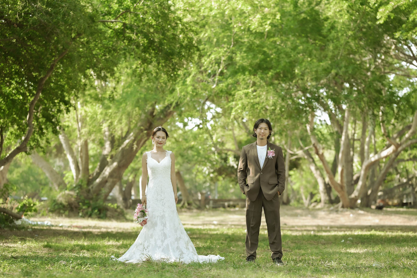 お昼をはさんで訪れたのは、ジンバランにある緑いっぱいの自然スポット。木々に囲まれた森の中は、海辺とはまた違った落ち着いた雰囲気で、柔らかな木漏れ日が差し込むたびに、温かな光がふたりを優しく包み込みます。