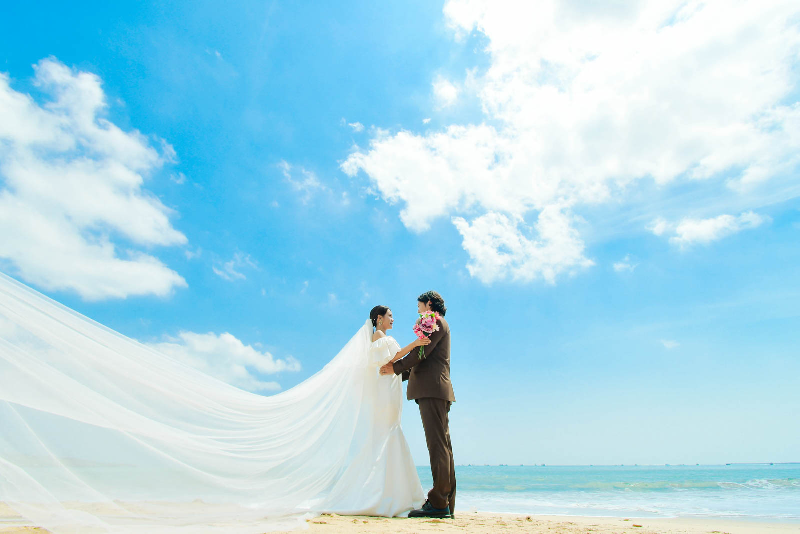 お二人のフォトウェディングは、穏やかな波が寄せるジンバランビーチからスタート。乾季らしい青空が広がり、エメラルドグリーンの海がきらめく中での撮影でした。