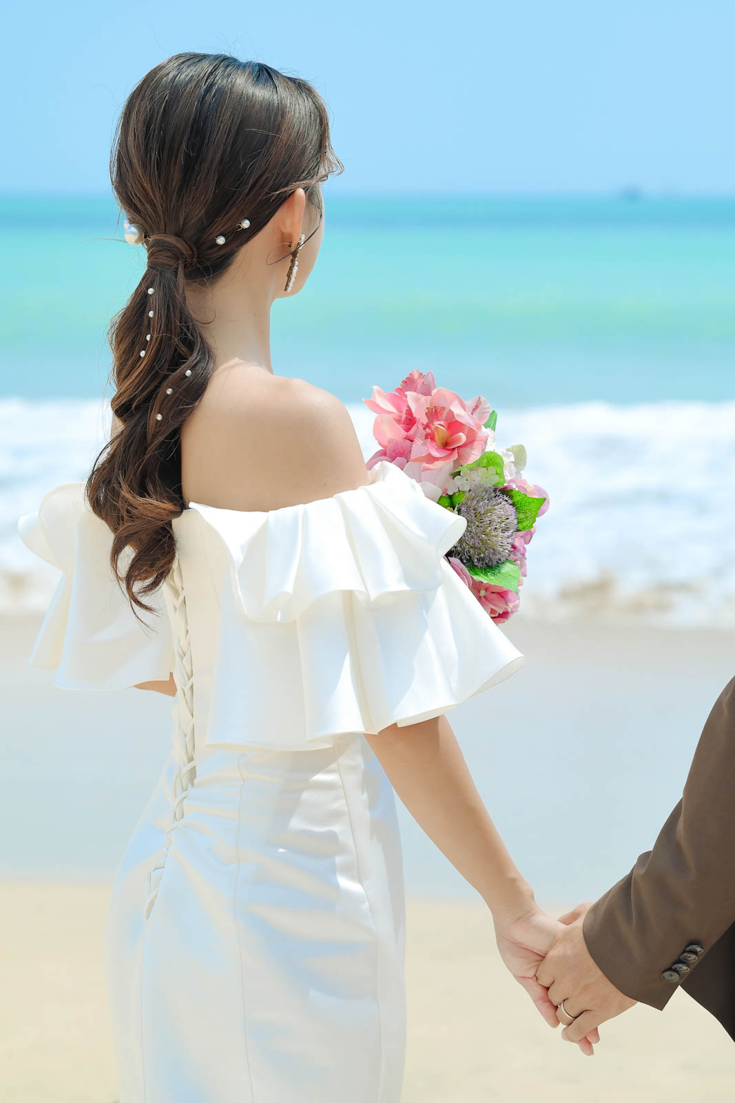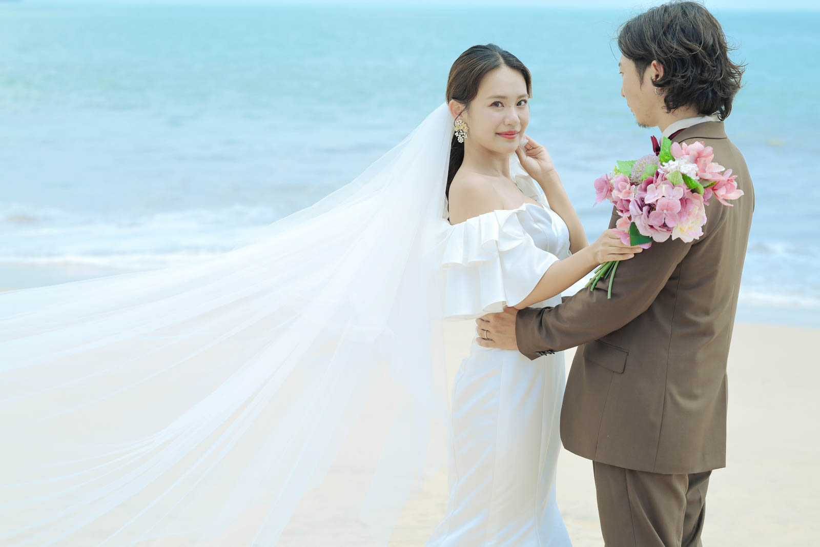 肩まわりのフリルが軽やかに風を受け、動くたびに柔らかく揺れるデザインです。花嫁さまの明るい笑顔と、海風にふわりと舞うベールがとても印象的でした。