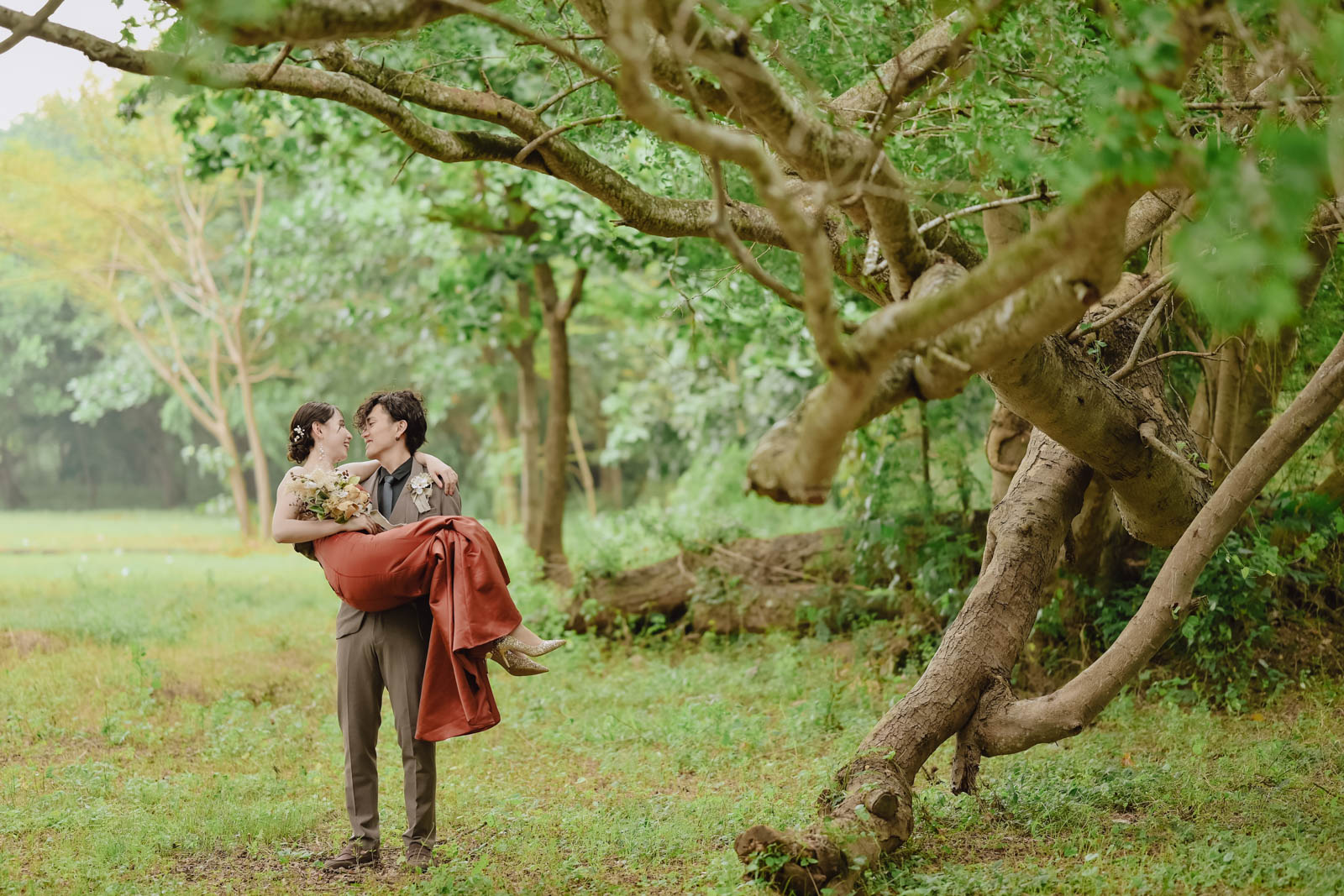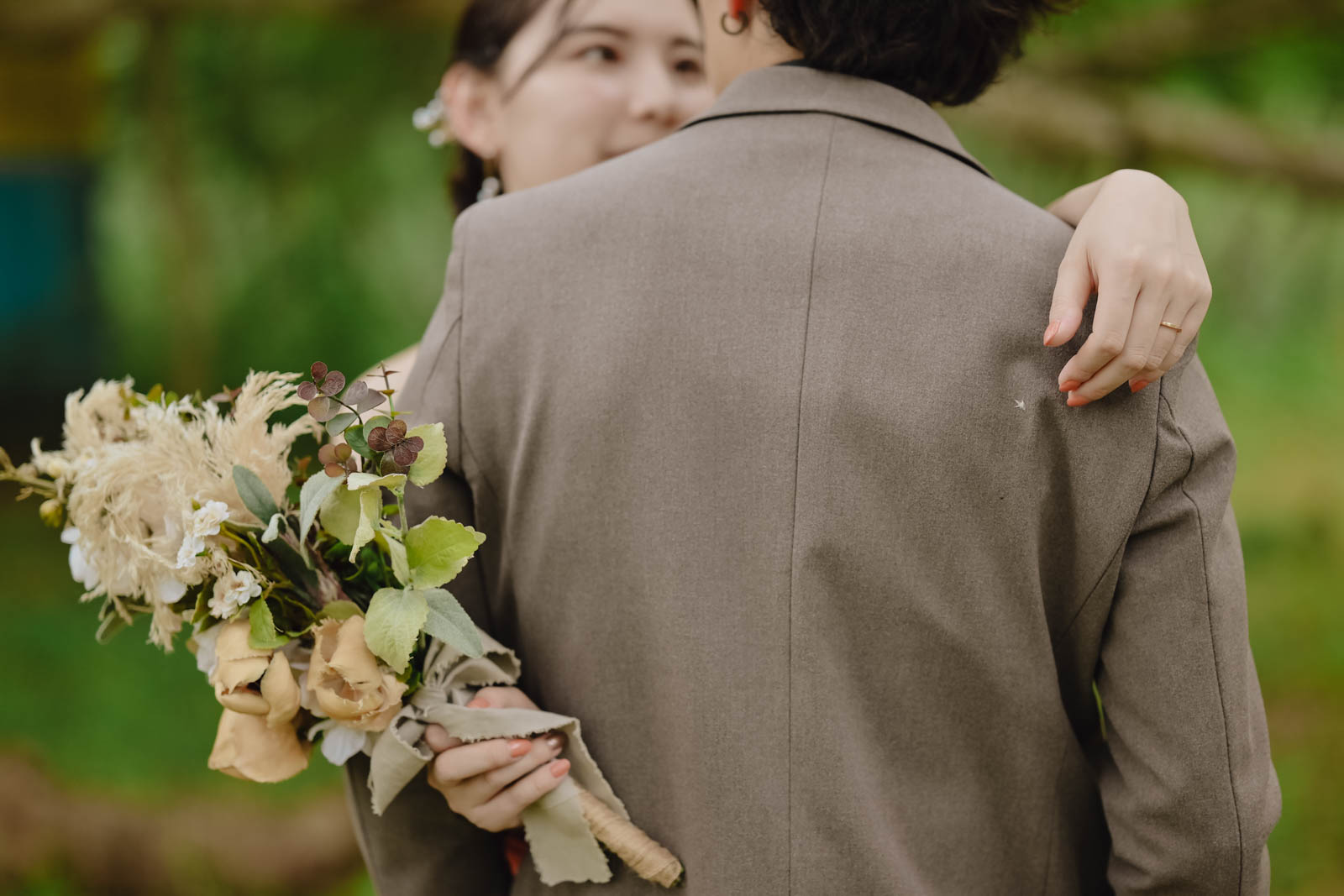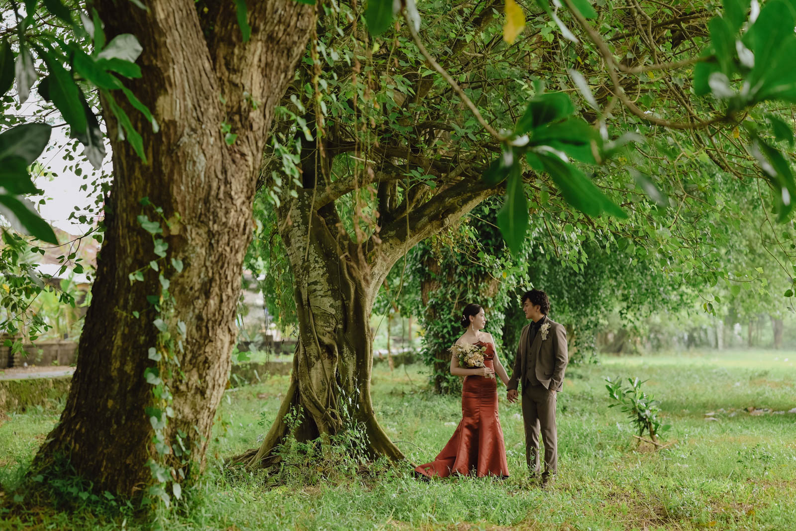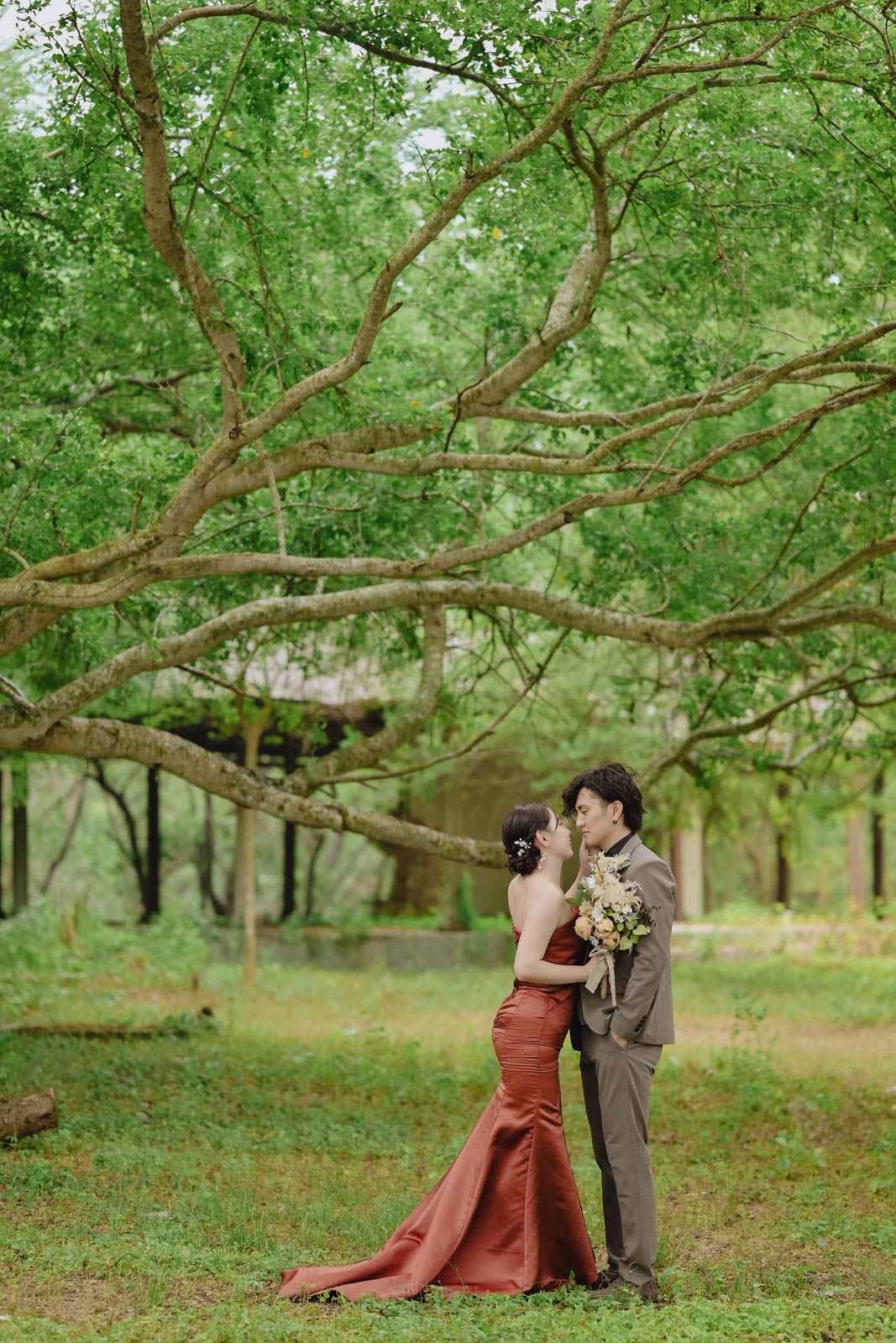 木々の間から差し込む光と、緑の奥行きが感じられる背景は、ナチュラルな美しさを引き出すフォトスポット。静かな空間の中で、おふたりが見つめ合うシーンはまるで映画のワンシーンのようでした。