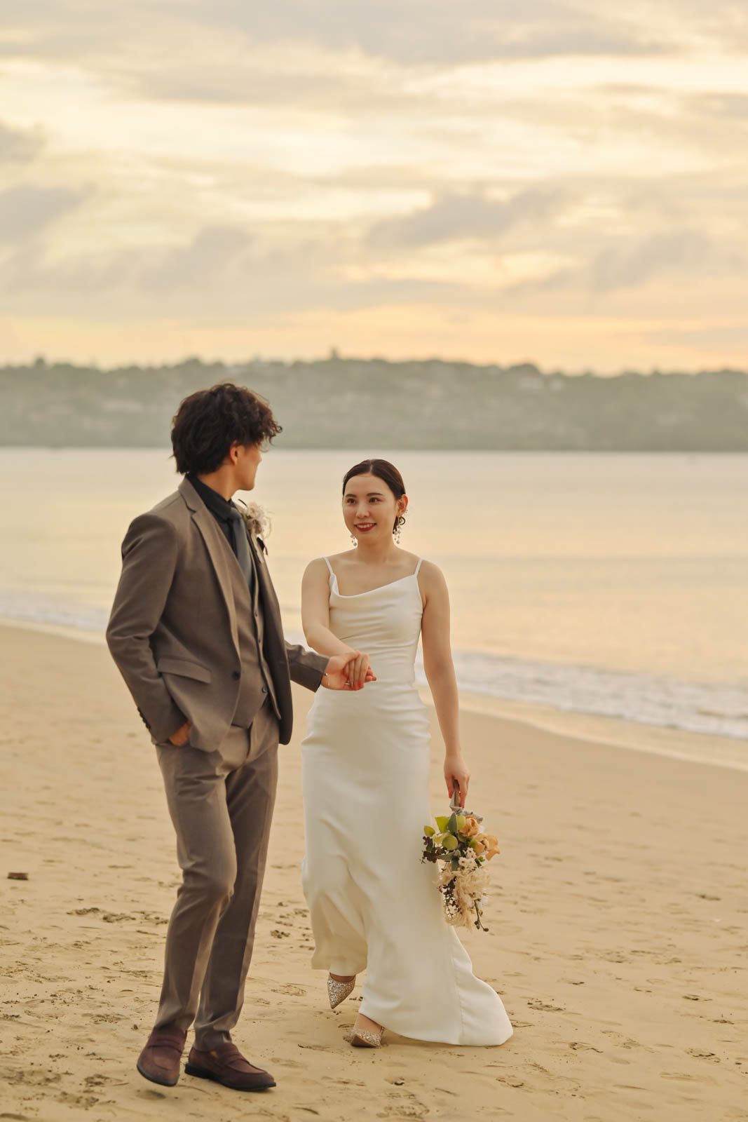ドレスの裾を軽やかに揺らしながら歩くカットや、おふたりで寄り添って見つめ合うカットなど、どれも爽やかでリラックスした雰囲気。バリの風を感じる一枚一枚に、おふたりの仲の良さがそのまま写し出されています。