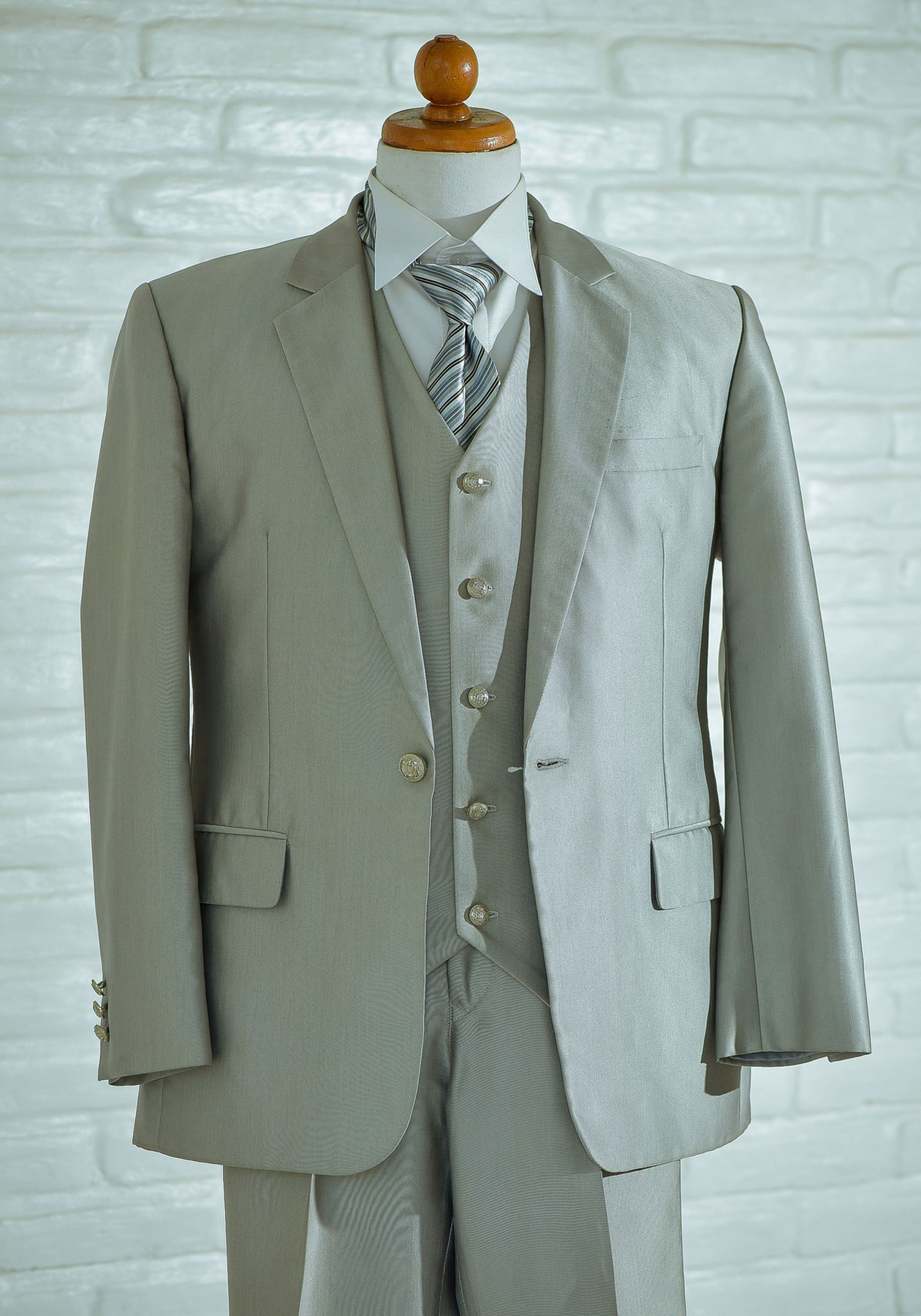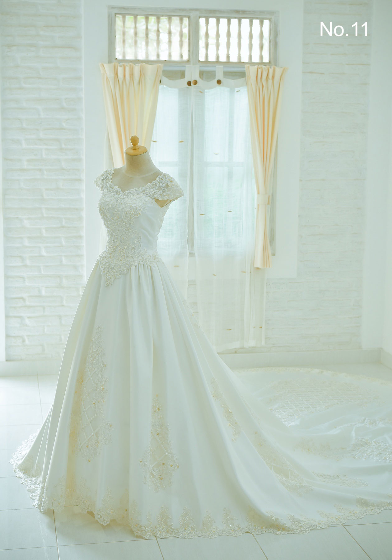 撮影当日、まずはドレスサロンで衣装選びとヘアメイクをしました。Mさんは袖付きのドレス No.11。トレーンが長くて後ろ姿もドラマチックに決まるドレスです。Tさんは光沢のあるシルバーのタキシードをお選びでした。とてもお似合いです!