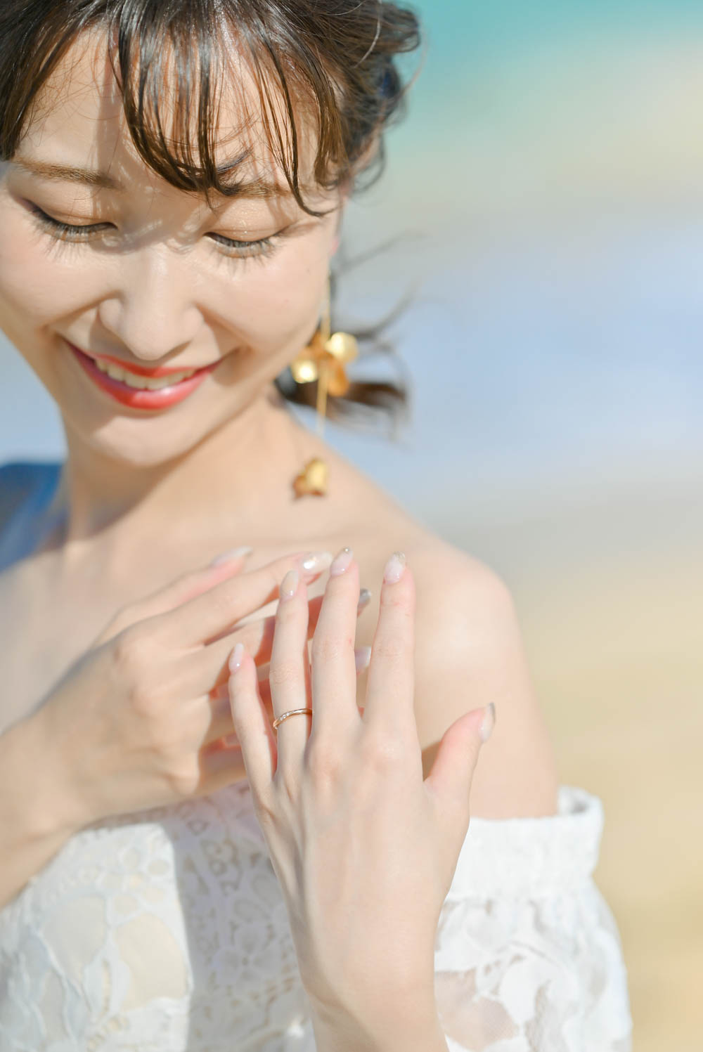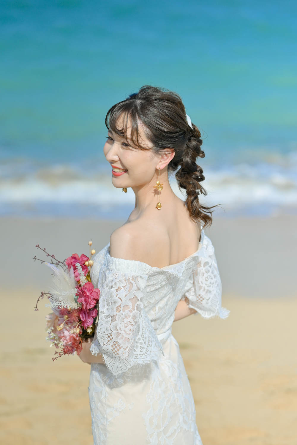 花嫁Aさんは、美しいオフショルダーのドレスを着て、シンプルなポニーテールのヘアスタイルです。