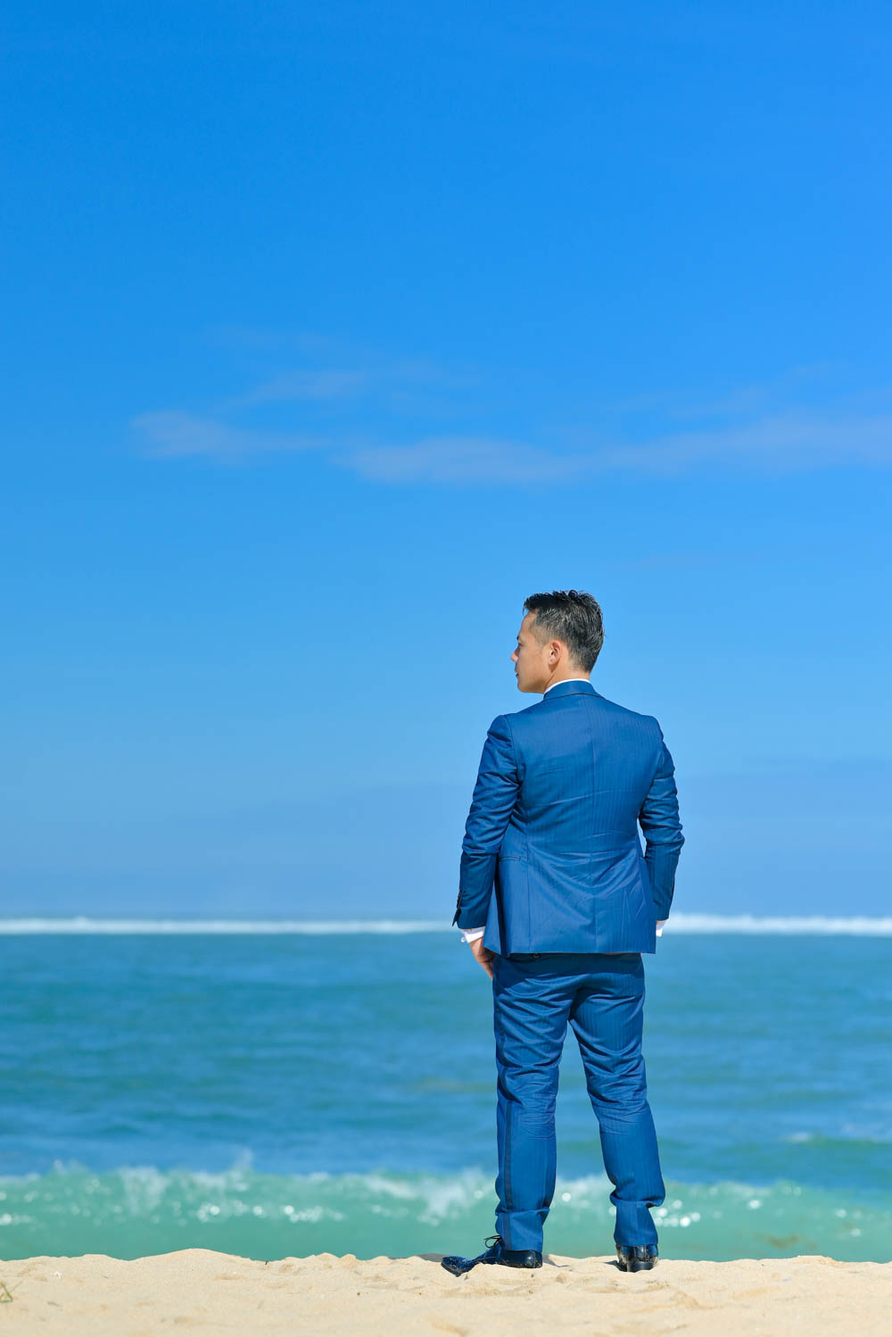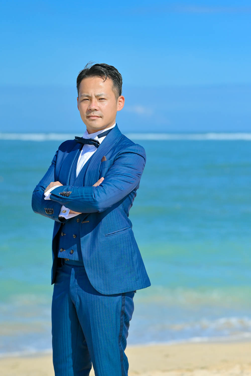 花婿Hさんは、ネイビーブルーのタキシードセットをご着用で、少しヘアセットもされています。