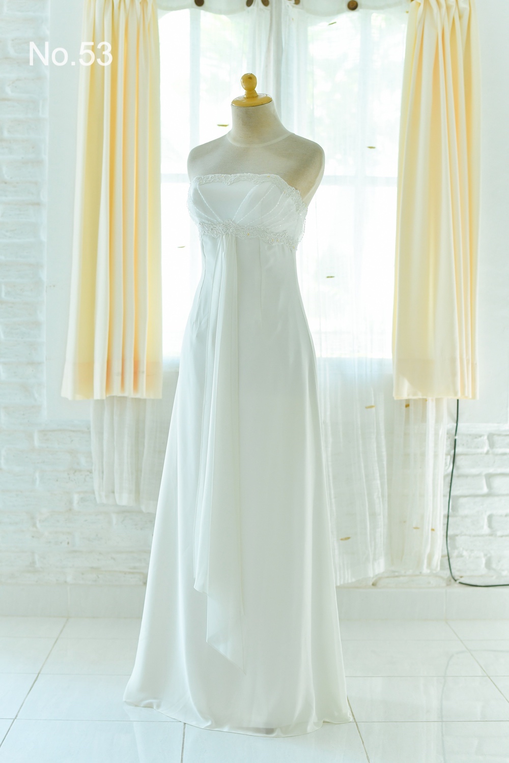 花嫁Kさんが選んだのはサロンLOVEISのWD-53。ギリシャ風のシンプルで品があるスレンダーモデルです。胸下のひらひらレースがポイントです。