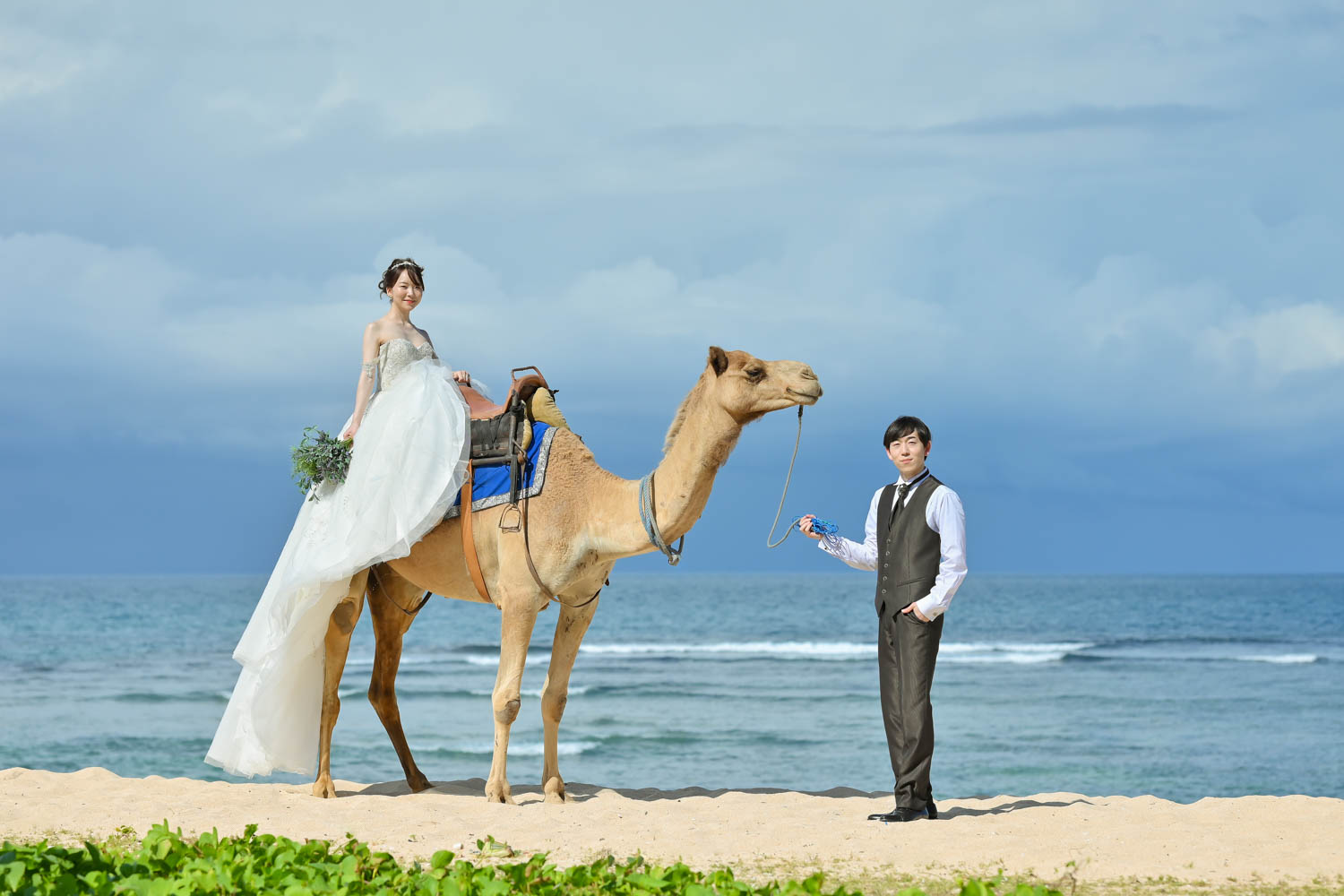 ヒルトンに到着したらビーチに向かい、お二人様はラクダに乗って撮影をしました。