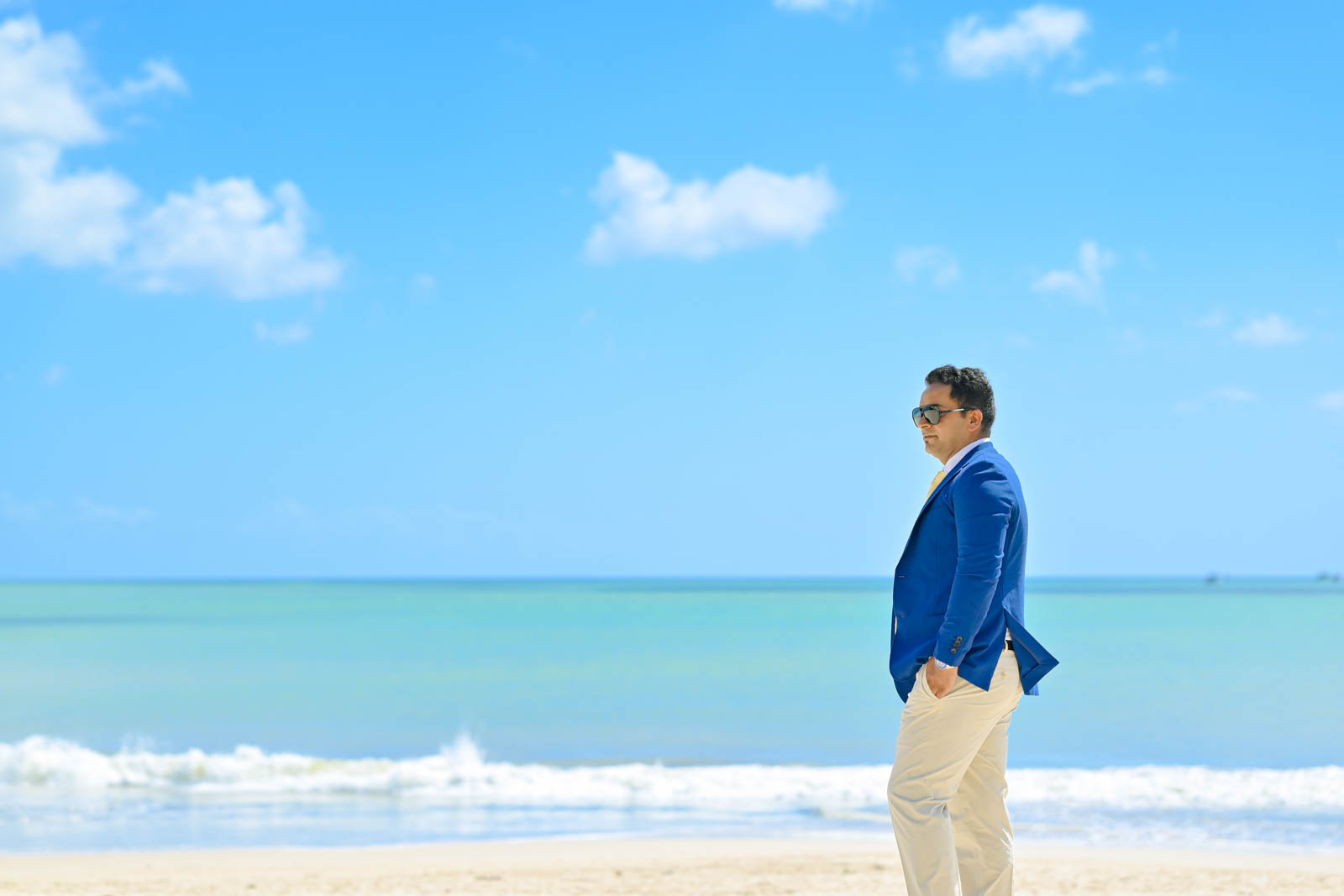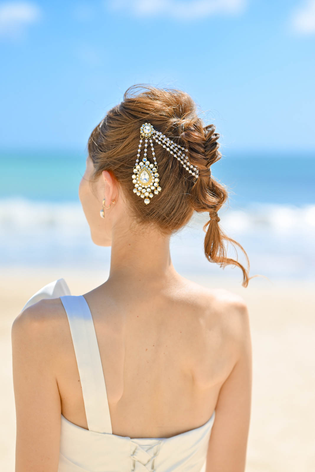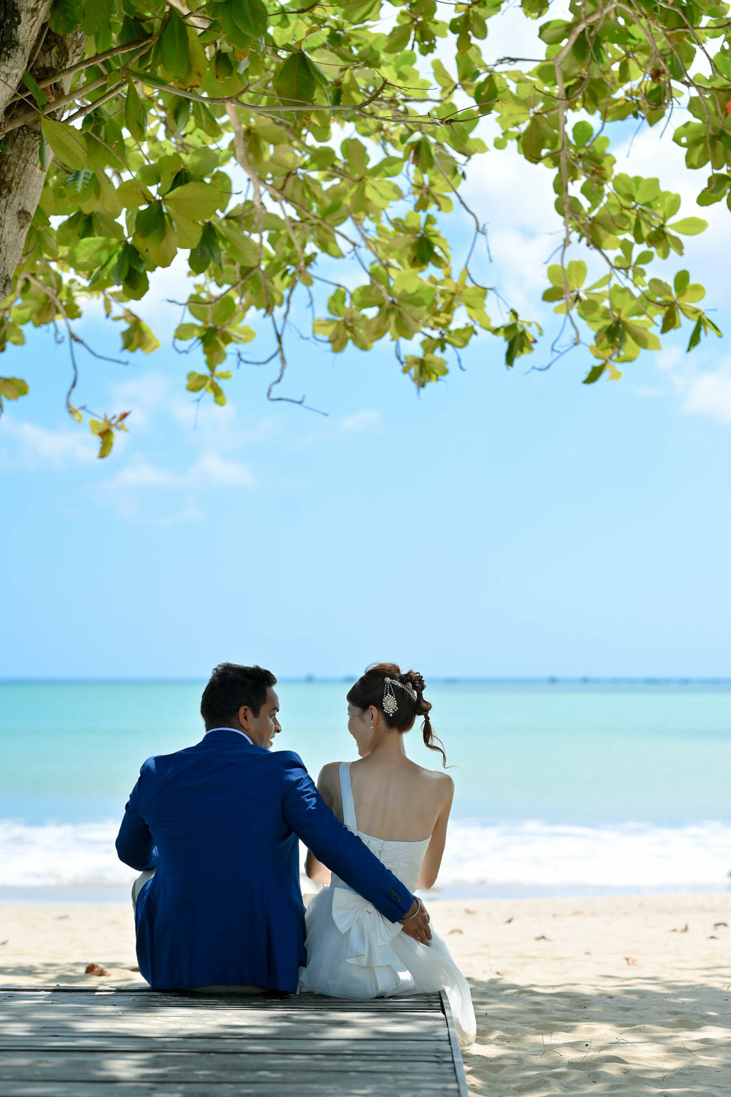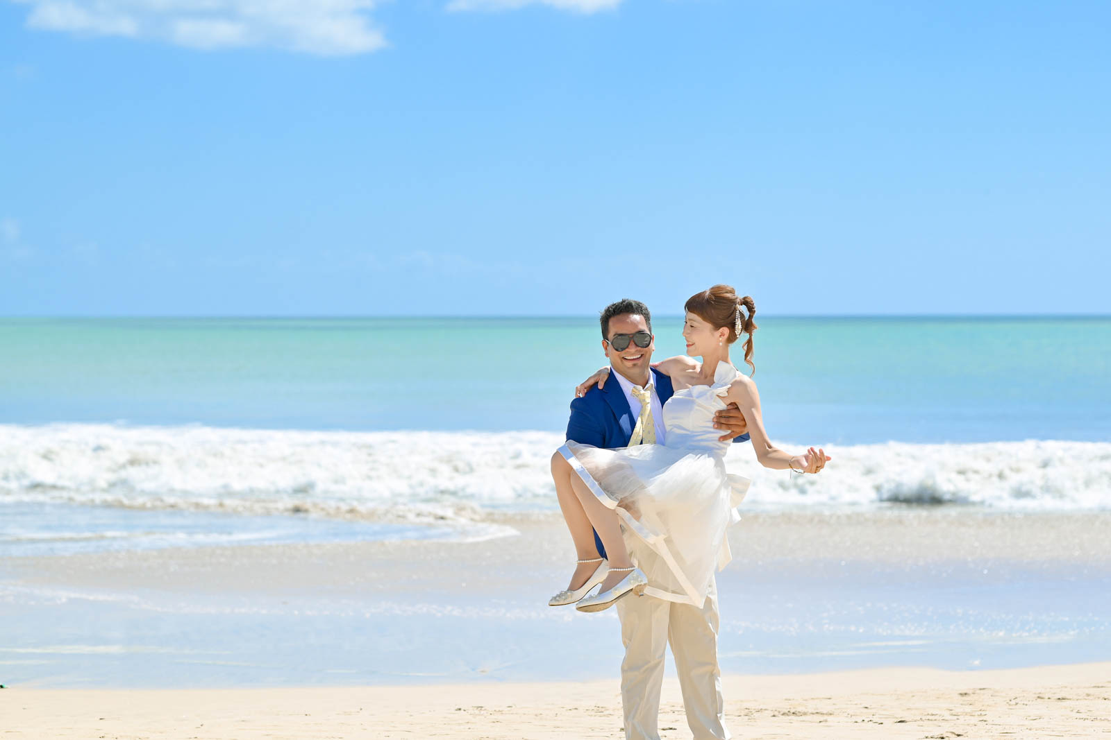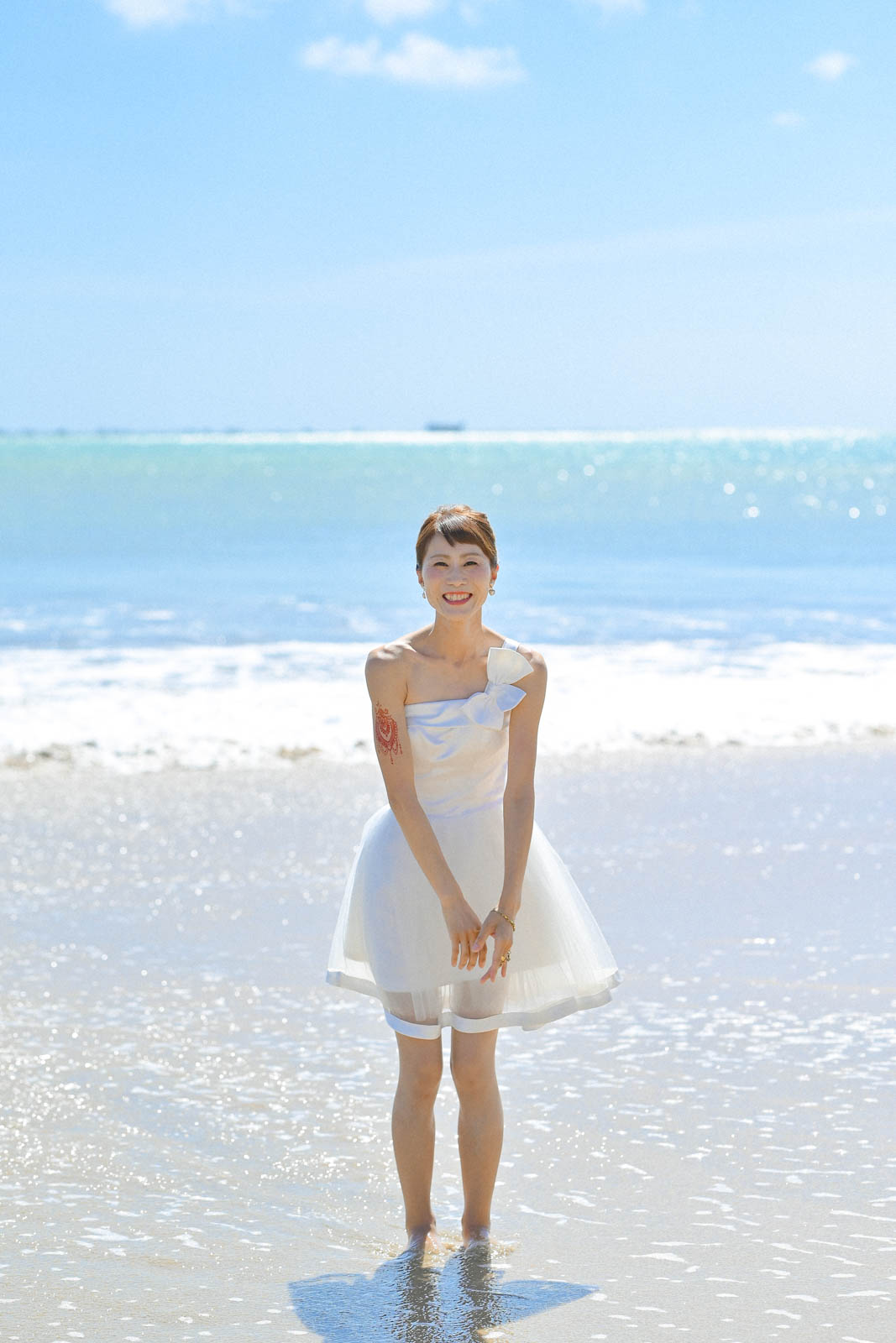 お二人のスタイルはシンプルでおしゃれ。そのカジュアルな感じがお二人の個性にぴったりで、ビーチでの楽しい撮影にもマッチしていました。花嫁様は動きやすくて可愛いミニドレス。日本人スタイリストによるヘアメイクもご利用いただきました。