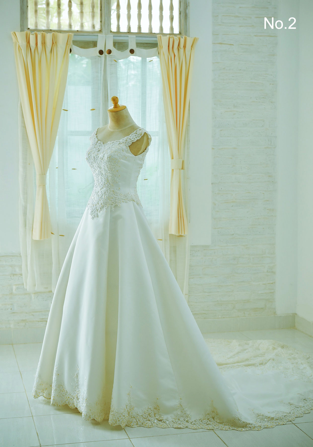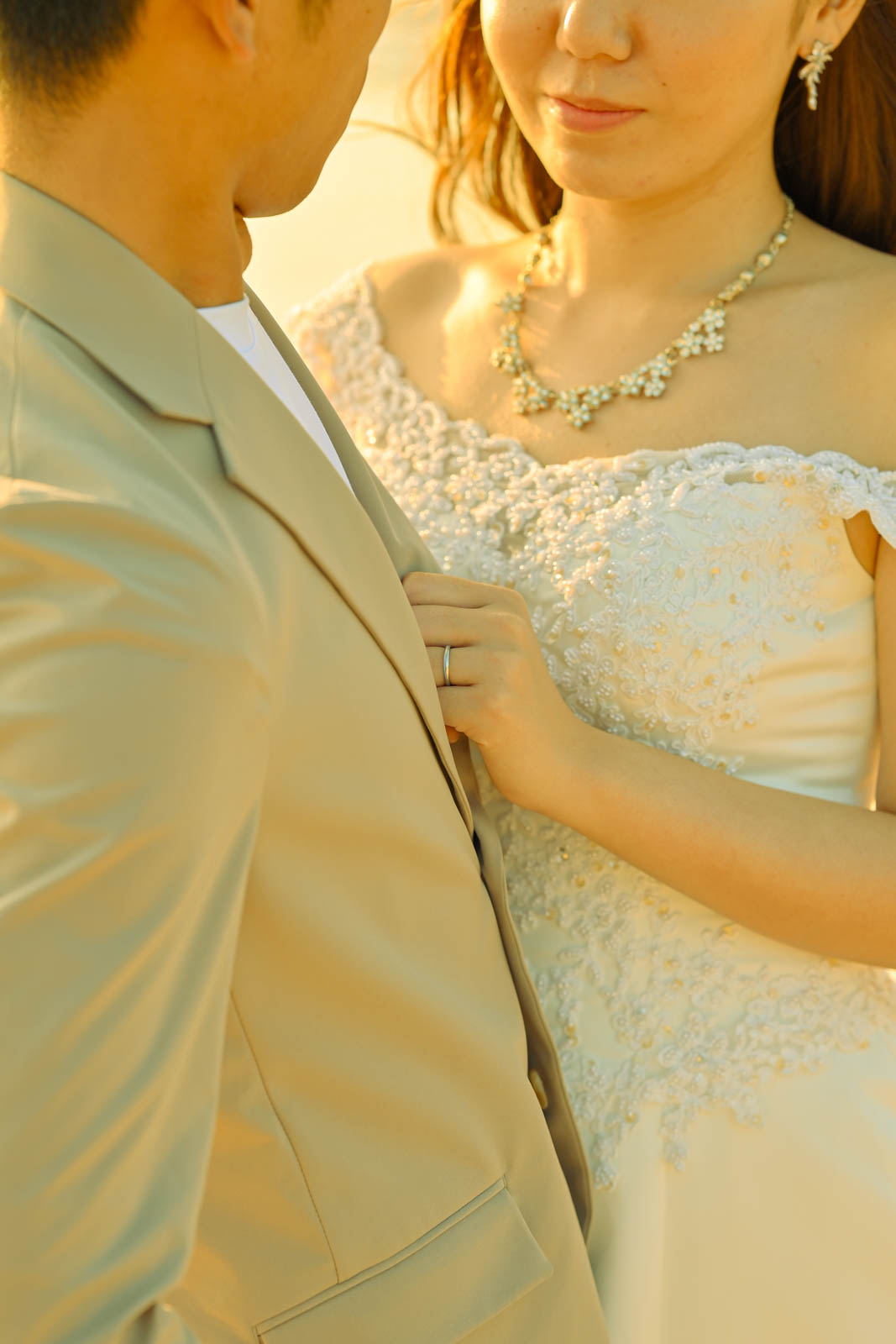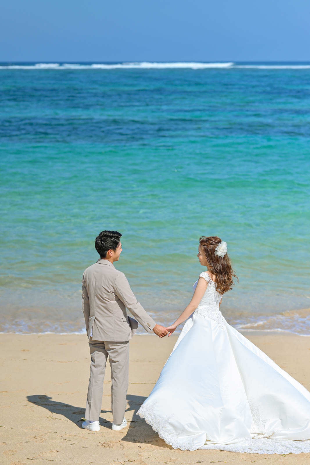 新郎Tさんは日本から衣装を持ってきてくれました。新婦Sさんはサロンでレンタル、選んだのはWD-2のドレス。シンプルなデザインで、アクセサリーも合わせやすい人気モデルです。サイズは7号〜13号までご用意しています。ヘアスタイルはダウンヘアにアレンジされました。
