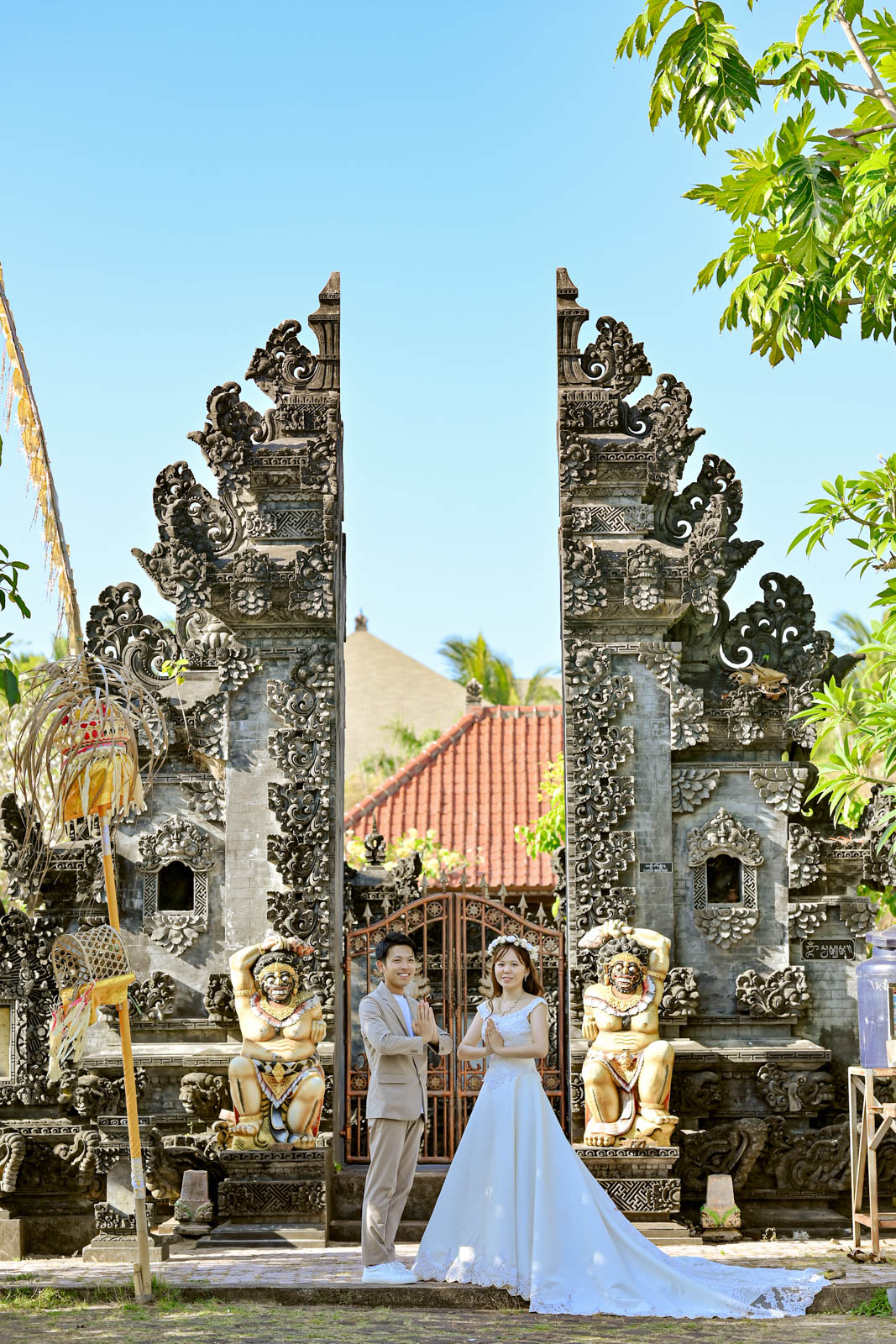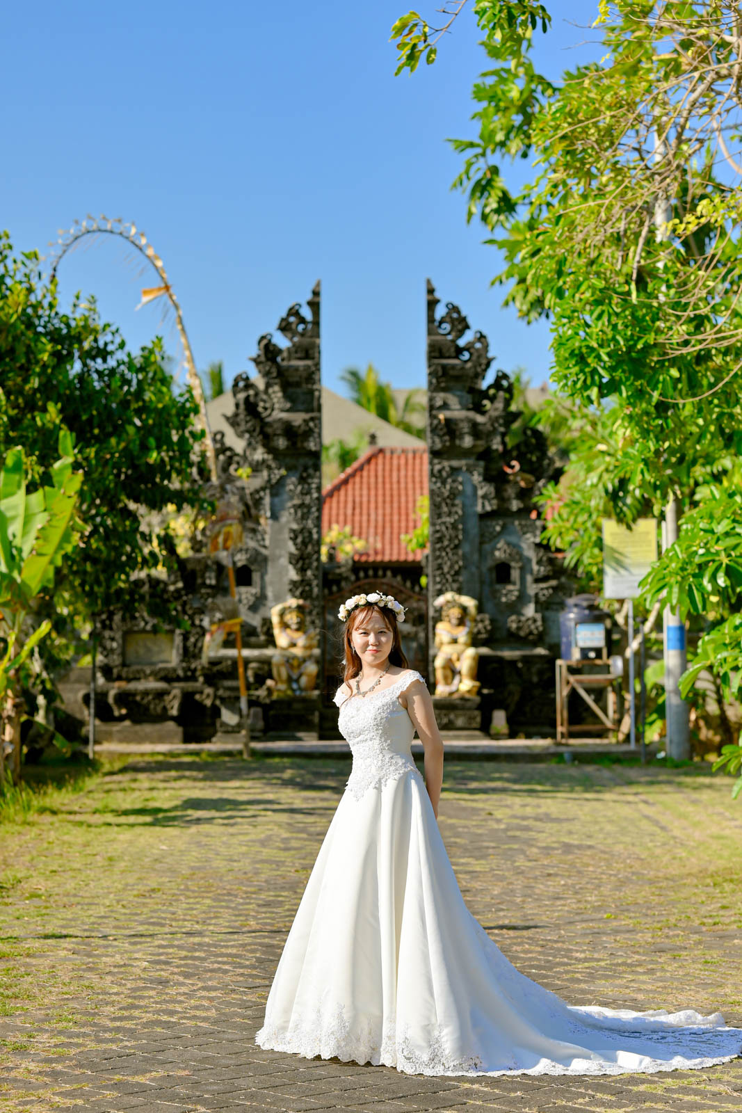 2ヶ所目は街中に移動して撮影しました。Sさんは日本から持ってきてくれた花冠を乗せて可愛らしい雰囲気に。バリ寺院や商店にも行きました。