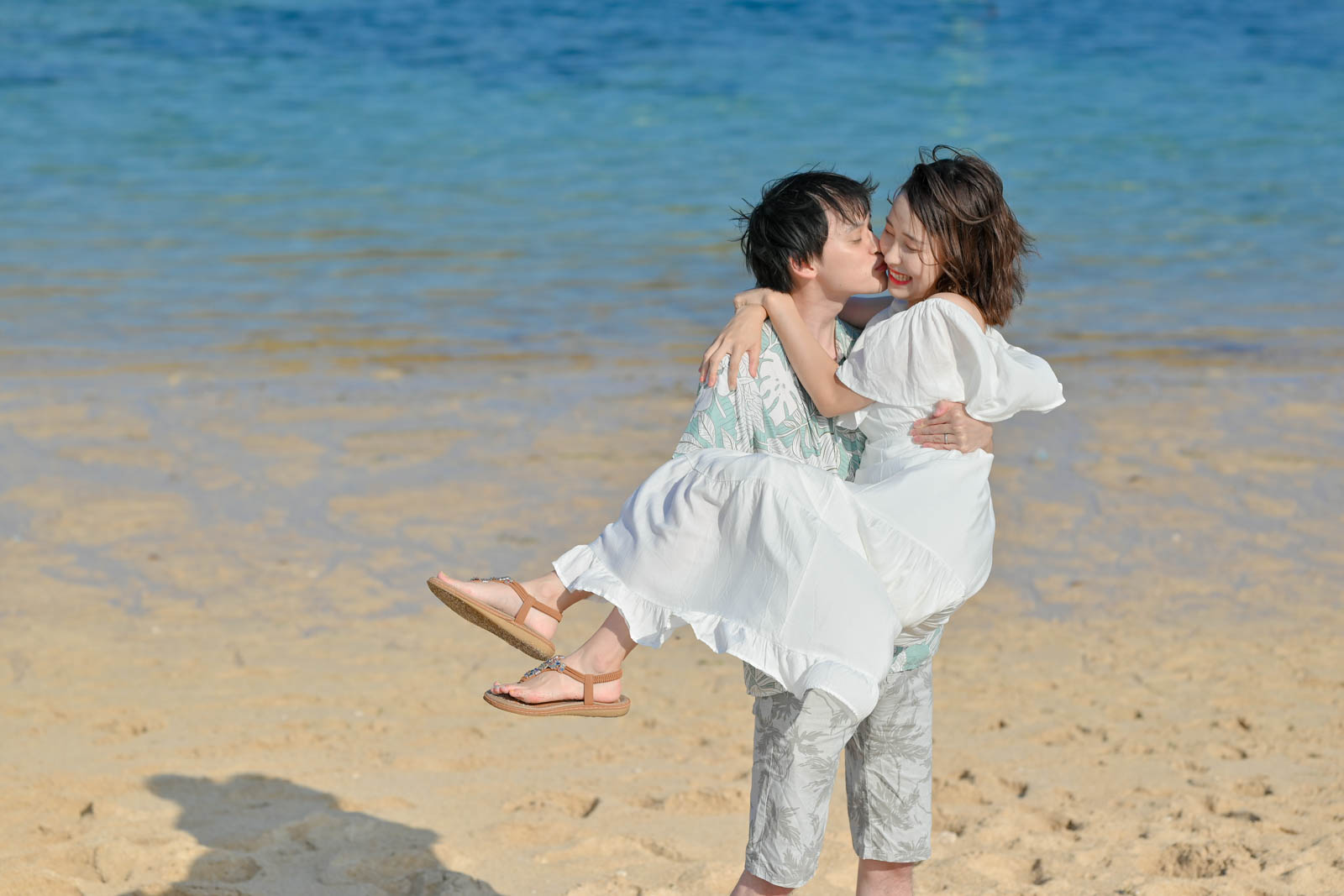 この日は青空が広がり、エメラルド色の美しい海がとても印象的でした。ビーチではロマンチックな写真や楽しい雰囲気の写真を撮影しました。