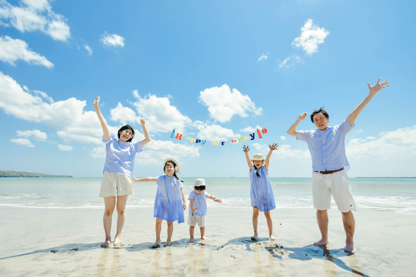 ジンバランビーチの眺めは素晴らしく、砂はサラサラで綺麗な貝殻もたくさんあり、砂遊びにも最適という最高のロケーションの中、普段育児で多忙でじっくり見られない子どもたちの一瞬や、夫婦の時間を、様々なアングルからきれいに撮っていただき、プロの方にお願いしてよかったと感じます。