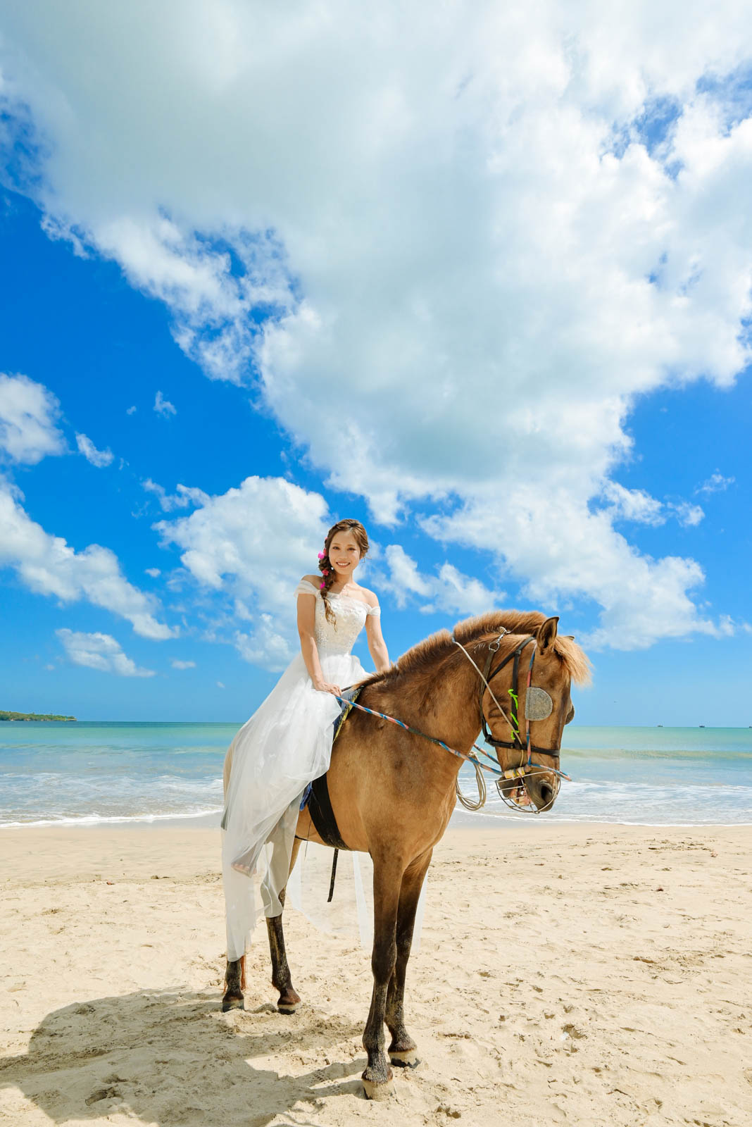 バリ島ジンバランビーチで、馬に乗って砂浜を散歩しながら撮影できる特別なフォトウェディングプラン。