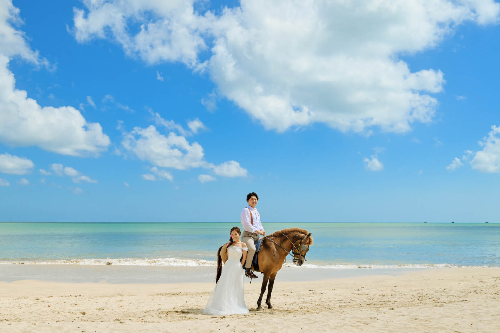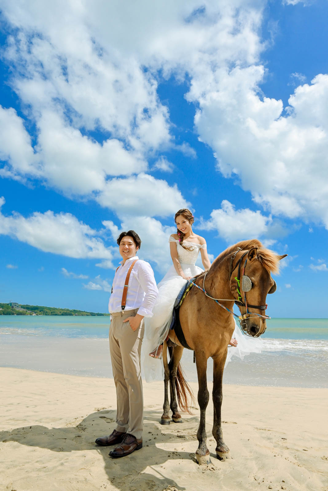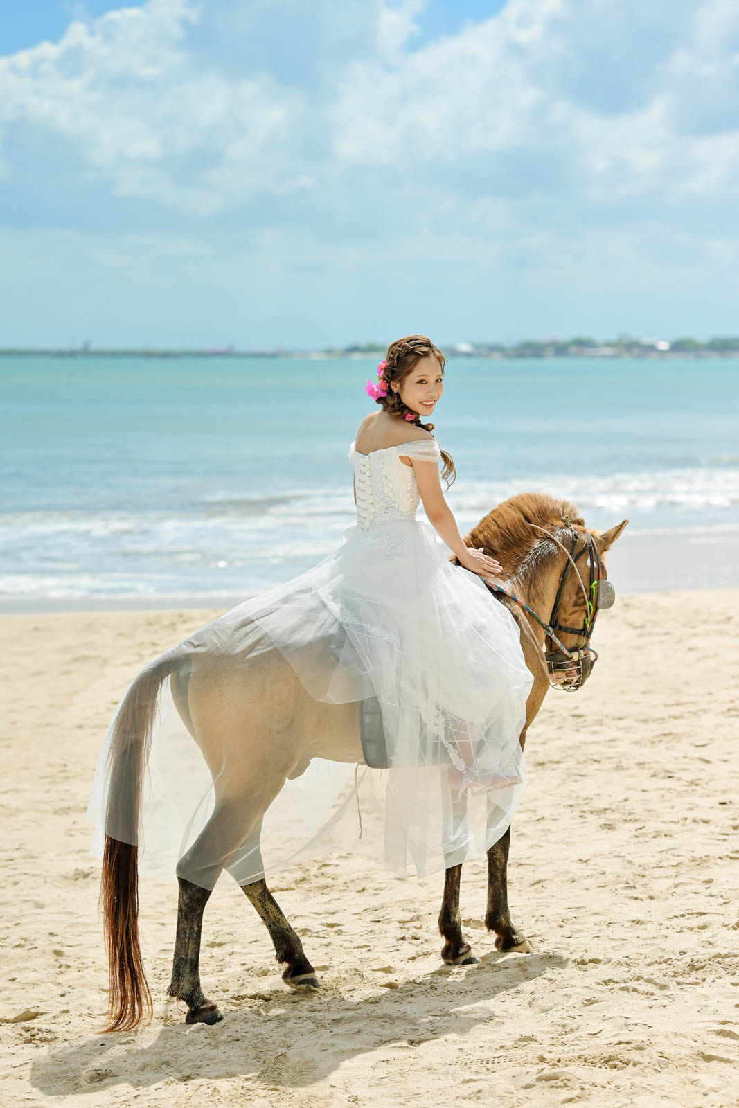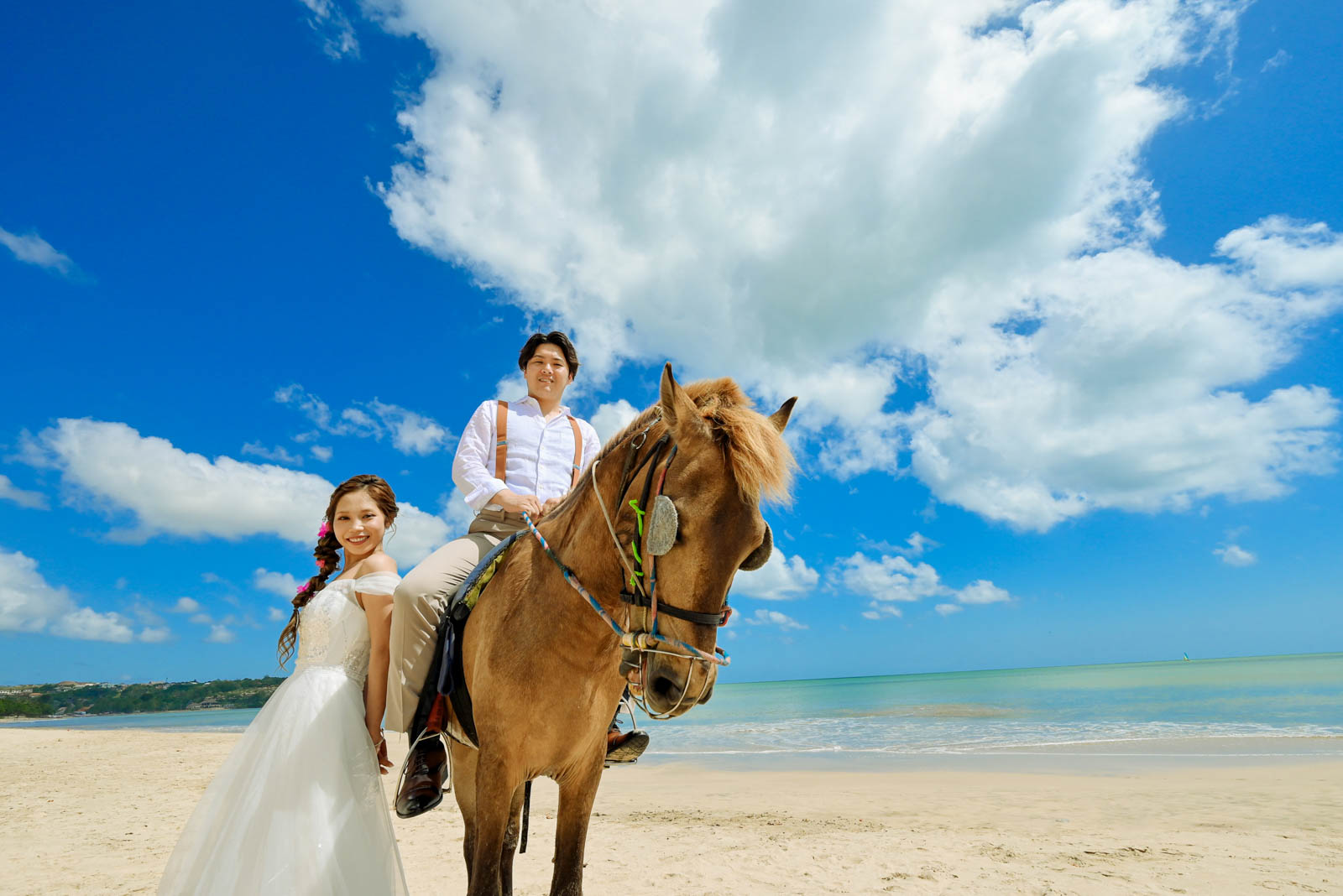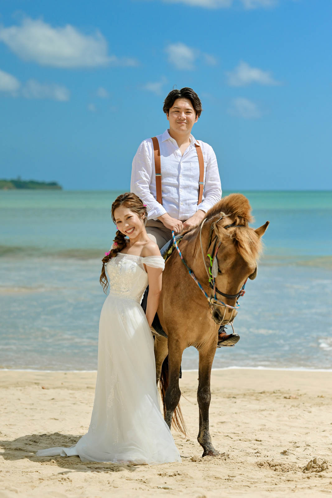 2頭の馬を手配するため、一人ずつ乗ってのショットはもちろん、1頭に2人で乗るロマンチックなシーンも撮影できます。30分のホースライドが終わって馬を降りてからは、ナチュラルなビーチフォトの撮影も楽しめます。